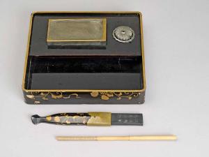 Scatola per calligrafia (suzuribako), al cui interno sono presenti la pietra per sciogliere l'inchiostro, la boccettina per l'acqua, un pennello e una custodia a forma di ventaglio.