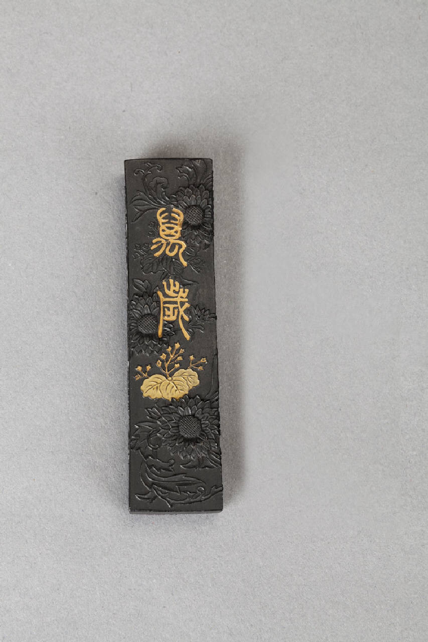 Scatola per calligrafia (suzuribako), al cui interno sono presenti la pietra per sciogliere l'inchiostro, la boccettina per l'acqua, un pennello e una barretta d'inchiostro.