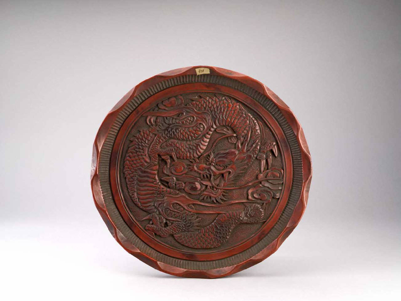 Vassoio circolare in "legno scolpito e laccato a colori" (chomoku saishitsu), rosso e nero, con orlo movimentato all'interno da una lobatura di andamento regolare. Al centro del fondo è invece presente la figura di un drago (ryu) tra le nuvole (kumo). E' presente un foro, probabilmente praticato per appendere il piatto.