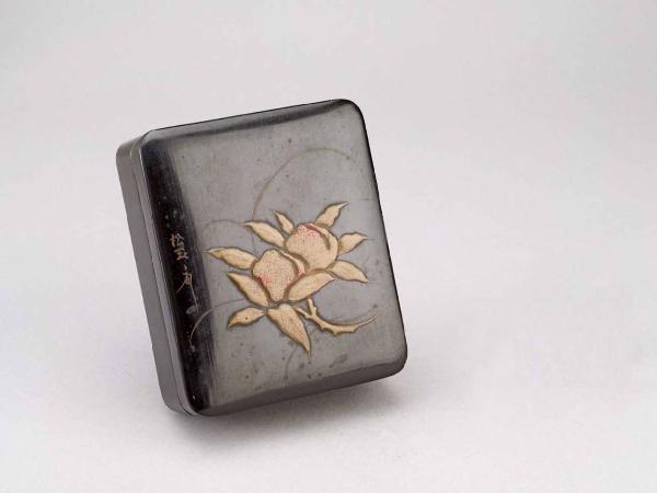 Scatola a sezione rettangolare in legno laccato di nero con bordi filettati d'oro. Sul coperchio è raffigurato in rilievo un ramo con foglie e due melograni.
