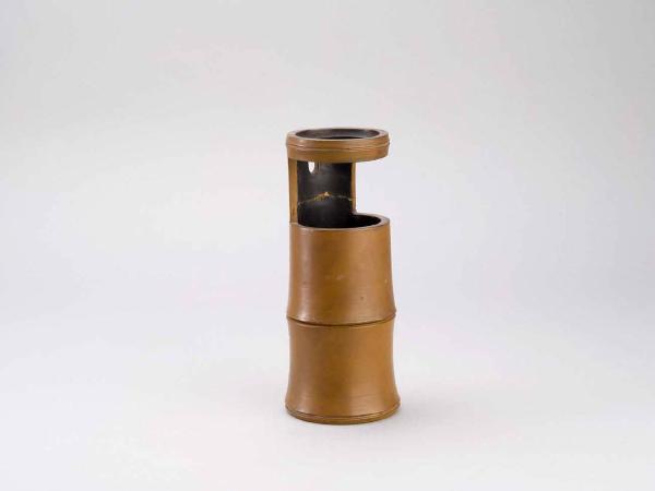 Vaso per ikebana a forma di canna di bambù, laccato marrone. Ha all'interno una scodella laccata rossa, decorata internamente in oro.