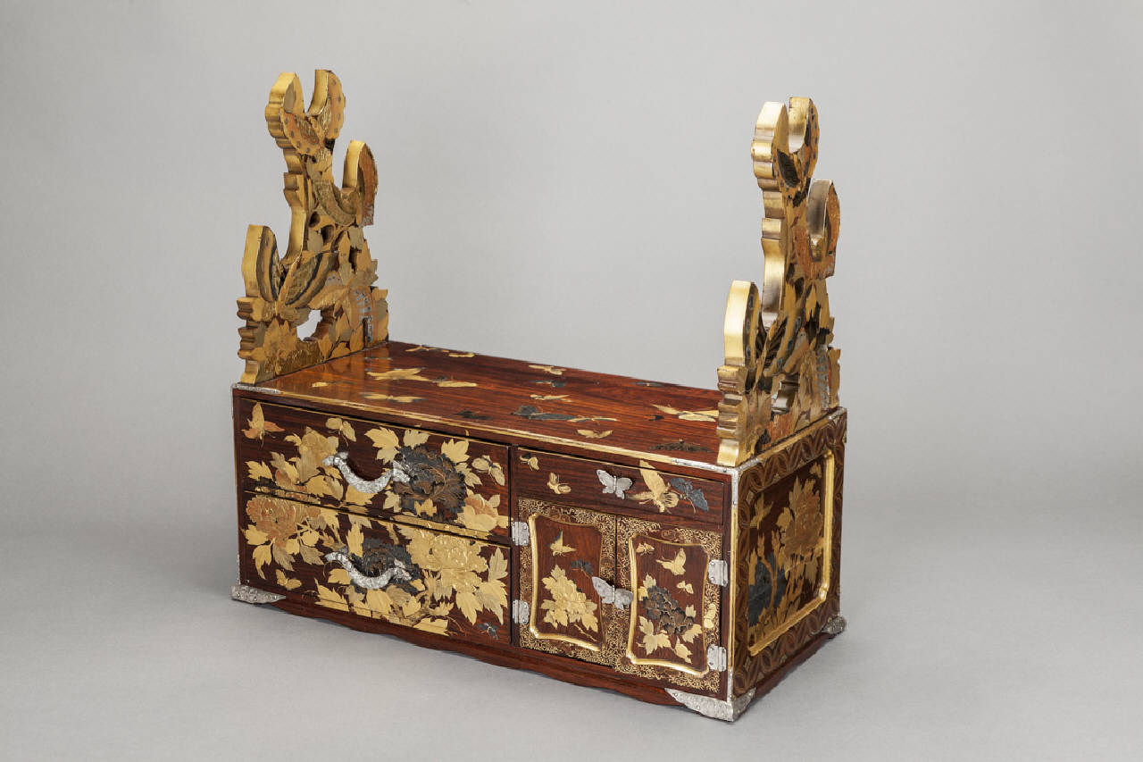 - NOTIZIE STORICO CRITICHE Il portaspade giapponese (katanakake) consiste solitamente di tre parti (base, due supporti e un braccio che collega questi ultimi) che si possono facilmente smontare. Questa tipologia di oggetto venne in auge nel periodo Momoyama (1573-1615): nelle residenze di Toyotomi Hideyoshi (1536-1598) furono ritrovati molti portaspade simili che si possono forse considerare i più antichi, decorati prevalentemente con la tecnica della lacca nota come Kodaiji. La loro forma può forse derivare da quella degli appendiabiti in legno laccato (iko o eko), famosi anche perché raffigurati su quel genere di dipinti noto come Tagasode ("Di chi sono quelle maniche?"), il quale consiste proprio in una serie di abiti posati su quel tipo di rastrelliera. Gli esemplari di portaspade più antichi erano di dimensioni maggiori rispetto ai successivi, potendo sorreggere da tre a cinque spade: questa caratteristica dipende sostanzialmente dall'evoluzione del tipo di spada prediletto dai samurai, che venne man mano a diventare di minori dimensioni rispetto al passato.\nQuesto esemplare è una variante abbastanza inusuale della forma del portaspade, soprattutto per la presenza della cassettiera. Essa potrebbe indicare l'assolvimento di funzione prettamente ornamentale, così che possiamo supporre una sua datazione in epoca Meiji (1868-1912), periodo in cui il governo aveva proibito ai samurai di portare armi da taglio tradizionali in luoghi pubblici: la spada e il suo supporto erano quindi destinati ad occupare un posto negli ambienti di rappresentanza delle residenze, non nella camera da letto dove originariamente erano sistemati, a memoria di un tempo e di usanze ormai passate.\n\nIn mostra all'Esposizione Storica d'Arte Industriale. Milano, 1874