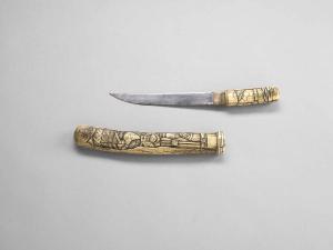 Pugnale privo di guardamano (aikuchi). Lama di pugnale in acciaio. Fodero di pugnale (saya) in osso intagliato e inchiostrato. Impugnatura di pugnale (tsuka) in osso intagliato e inchiostrato.