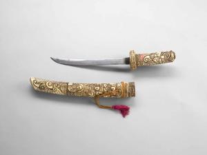 Pugnale di tipo tanto. Fodero (saya) di pugnale di tipo tanto in osso lavorato ad intaglio e inchiostratura. Impugnatura (tsuka) di pugnale di tipo tanto in osso lavorato ad intaglio e inchiostratura. Con guardamano (tsuba).