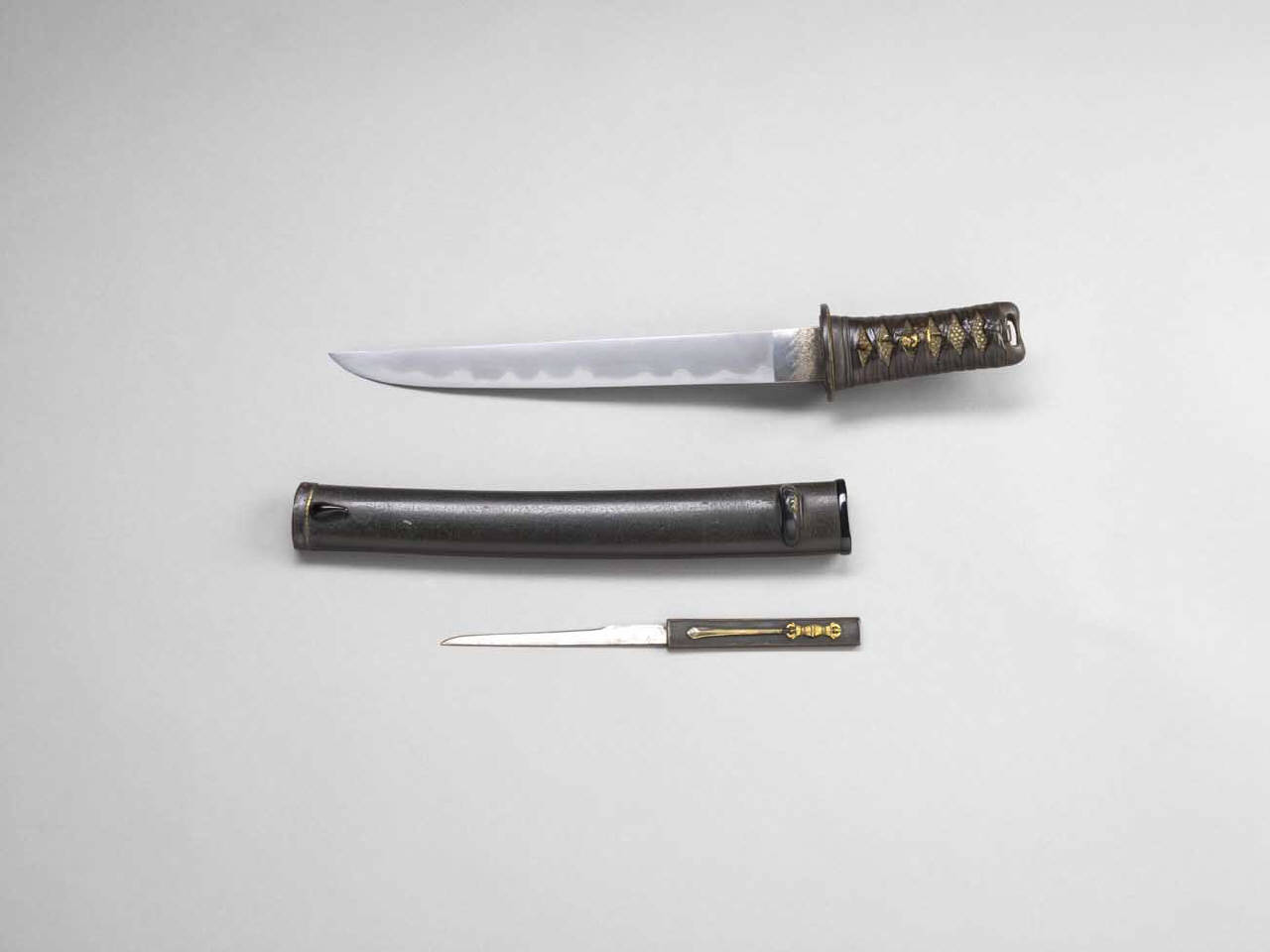 Pugnale (tanto) con fornimenti e coltellino (kozuka). Montatura buke tsukuri. Fodero in lacca opaca nera con gancio d'arresto. Puntale in ferro con bordura in agemina d'oro; anello per il cordone in shakudo decorato a rilievo con dettagli in oro. Impugnatura (tsuka) rivestita di pelle di pesce (same) bianca con cordoncino (tsukaito) in seta marrone. Fuchi e kashira in ferro senza decorazioni. Menuki raffiguranti un gatto e una tigre con dettagli in argento e oro. Manicotto (habaki) in argento con linee oblique e parallele incise. La tsuba, in ferro, ha forma ovale (tatemaru); la superficie è leggermente granulosa (ishimeji); la decorazione, in alto rilievo (takabori) e dettagli in agemina d'oro (kinzogan), si compone di un saggio cinese su una barca nei pressi di una cascata (nachi). Il coltellino (kogatana) ha impugnatura (kozuka) in shakudo con superficie lavorata a bulino con punteggiatura regolare (nanako), sulla quale si dispone una decorazione in alto rilievo (takabori) in agemina d'oro (takazogan) raffigurante una spada con impugnatura a forma di vajra.