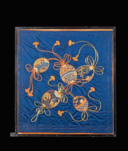 Tessuto in seta blu con decorazioni a ricamo policromo e oro raffigurante cinque ovuli attraversati da cordoni svolazzanti terminanti a foggia di fiore. All'interno degli ovuli sono ricamati motivi geometrici e zoomorfi (fenici, gru, granchi e tartarughe) di richiamo augurale. E' montato in cornice in legno.