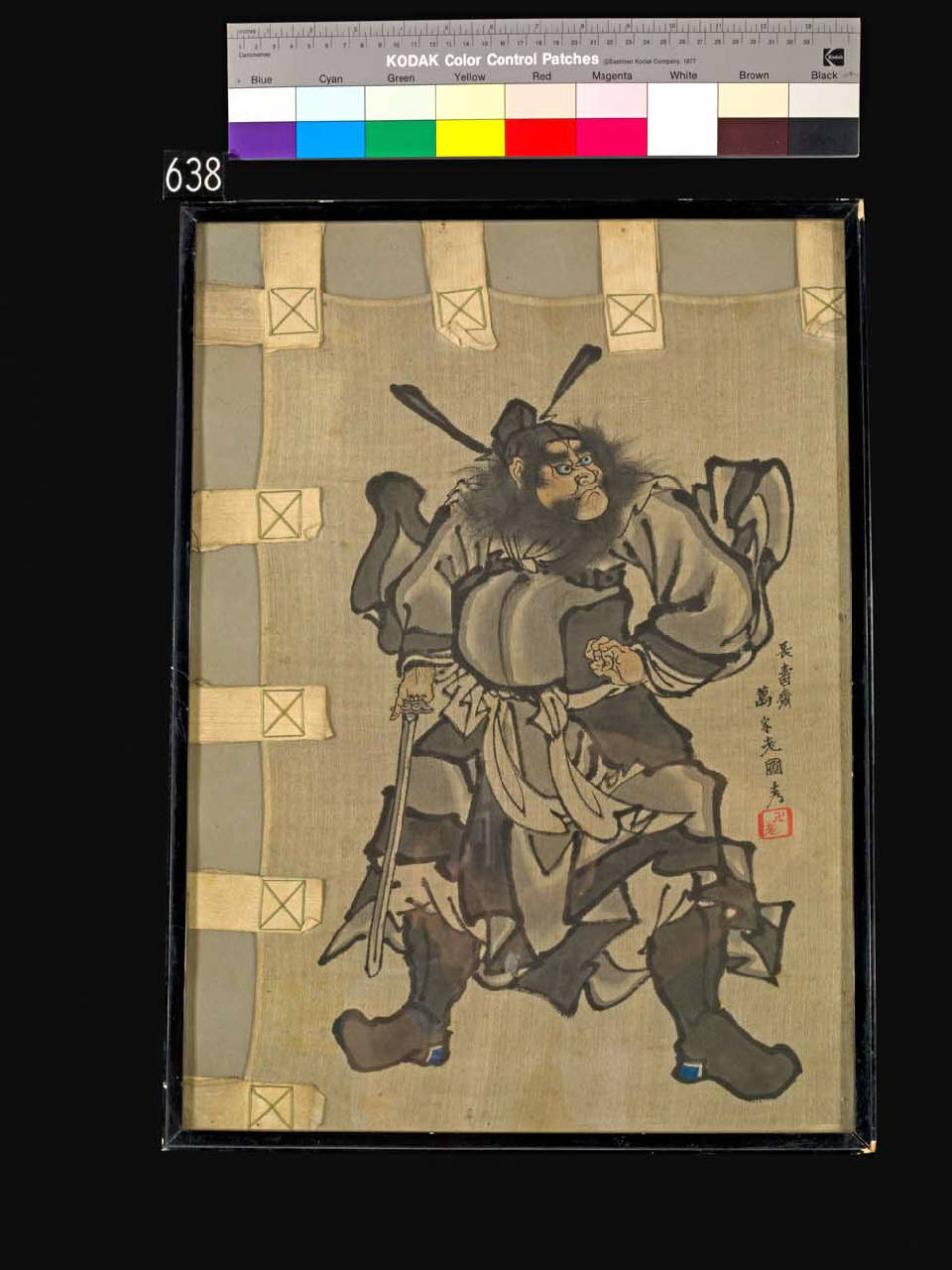 Dipinto a inchiostro e colori a tempera su seta raffigurante Shoki armato di sciabola e con cappello in testa. A sinistra e in alto linguette rettangolare in stoffa per distendere l'opera. Montato in cornice di legno con vetro protettivo trasparente.