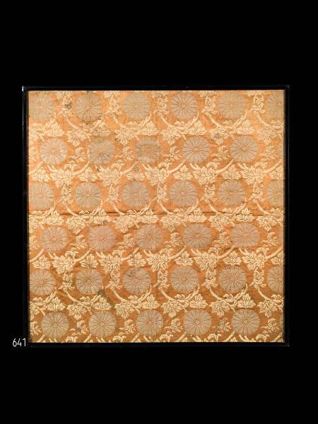 Tessuto operato con fili in oro cartaceo. Fondo rosso aranciato, disegno policromo in oro cartaceo di tralci (karakusa) a uno stelo (hitoe zuru) con fogliame, sopra i quali sono allineati in file orizzontali e parallele e sfalsate diagonalmente crisantemi di grande dimensioni bianchi a sedici petali (juruku yaye giku).