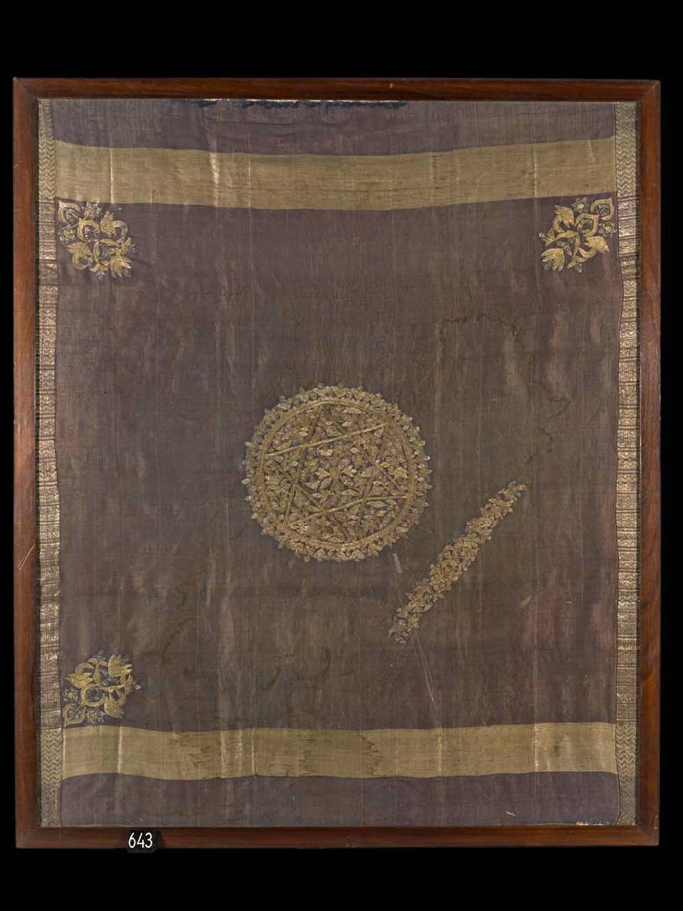 Ricamo su tessuto (nel ricamo si intuisce una sagoma di carta). Nella cornice trame supplementari in oro cartaceo. Fondo verde, disegno ricamato di medaglione con motivi floreali arabeschi; su tre angoli i fiori fantasiosi (hosoge). Ha una cornice al bordo d'oro tessuta. Montata su cornice di vetro.
