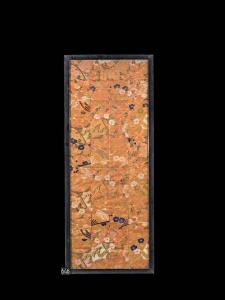 Tessuto operato formato da quattro strisce verticali con decorazioni in oro cartaceo, trame supplementari in seta policroma. Fondo rosso aranciato, disegno in oro cartaceo di losanga a corteccia di pino (matsukawa bishi) su cui sono disposti in modo sparso (chirashi moyo) ventagli (semmen chirashi) e fiore di prugno (ume) policromi.