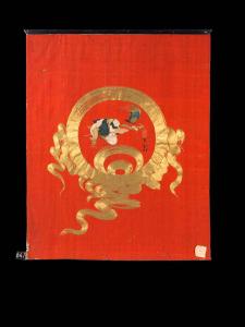 Ricamo su tessuto. Fondo rosso vivo con grande ricamo circolare (enso) in oro contenente al centro un ricamo policromo raffigurante una scena con Fukurokuju, dio della longevità, mentre sembra abbeverarsi da un grande piatto che tiene con entrambe le mani, accompagnato dal cervo, suo abituale compagno, dalla tartaruga millenaria (minogame) e da un rotolo dipinto (emaki). Ha bacchette in legno.