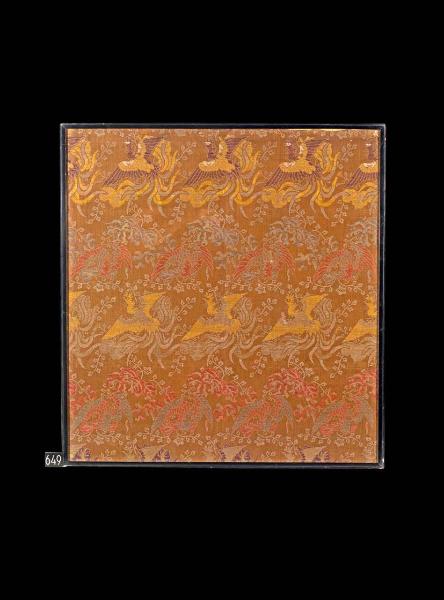 Tessuto operato con fondo diagonale, alcune trame supplementari sono in oro cartaceo. (probabilmente kinran). Fondo bruno marrone con disegno in seta policroma rossa e oro opaco di "uccelli fantastici in volo" (onaga dori) disposti su file orizzontali parallele sfalsate diagonalmente. Sullo sfondo motivi di fiori di pruno (ume) bianchi raccordati da tralci di foglie arricciate e germogli (karakusa). Montato su cornice in legno.