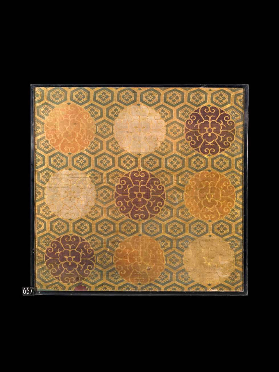 Tessuto operato con trame supplementari in oro cartaceo. Fondo oro cartaceo con disegno verde di rete con maglie esagonali a "guscio di tartaruga" (detto anche kikko isunagi) racchiudenti karahana (fiore classico cinese) verdi. Sopra la rete sono disposti su file orizzontali e parallele, crisantemi stilizzati policromi (arancione, giallo, bianco, viola, blu). Montato su cornice in vetro.