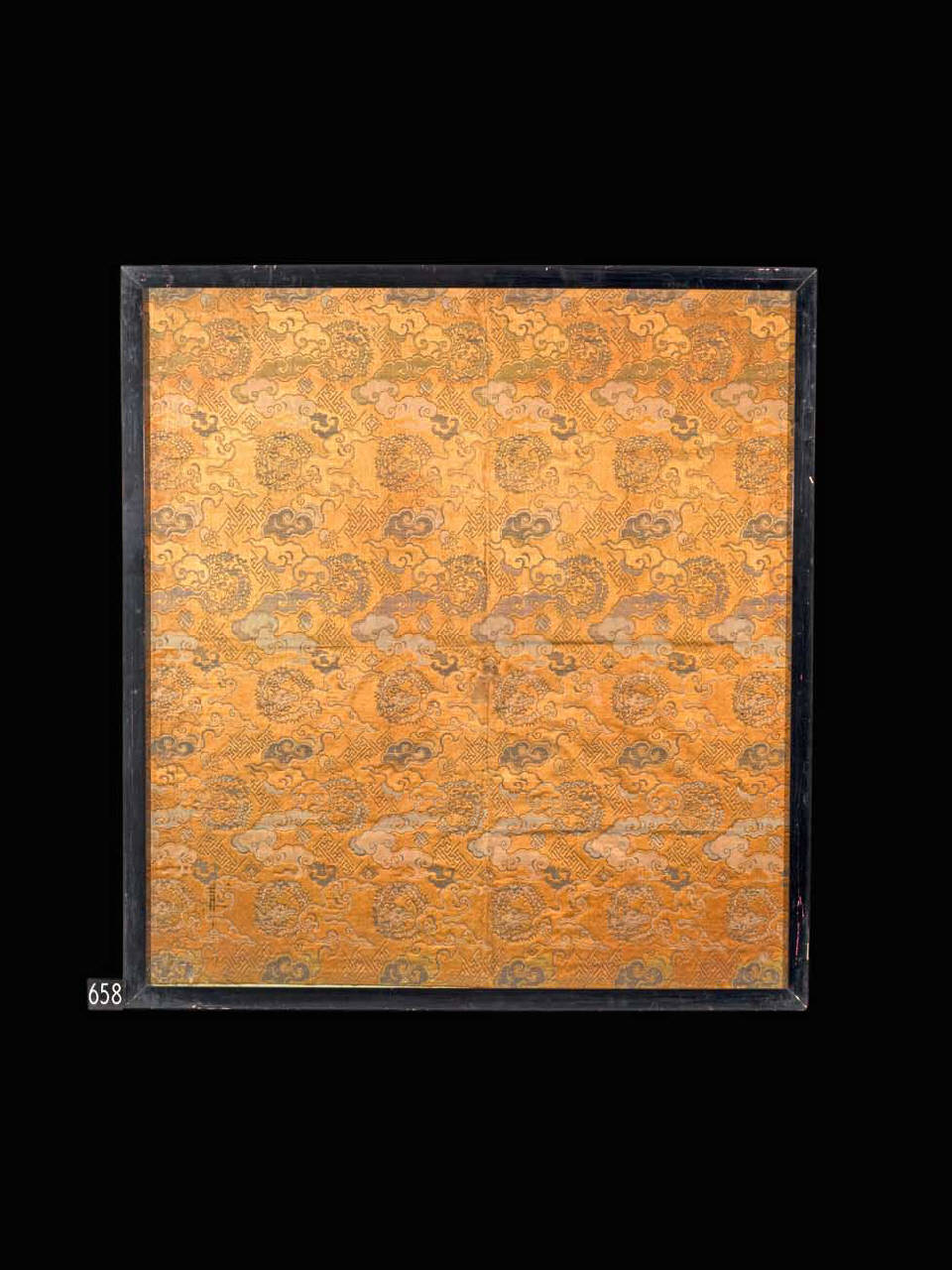Tessuto operato a fondo diagonale con trame supplementari in oro cartaceo e seta. Fondo rosso arancione, disegni policromi di draghetti (ryu) a tre artigli (detto lung) avvolti a cerchio, alternativamente volti a sinistra e a destra e intercalati da file di nuvolette a fungo (reishi gumo) orientate una volta verso l'alto, una volta verso il basso. I due motivi sono disposti su file orizzontali parallele, sfalsate diagonalmente in una sequenza di un drago e due nuvolette. Sul fondo sono sparsi emblemi augurali (takara zukushi). Montato su cornice in vetro.