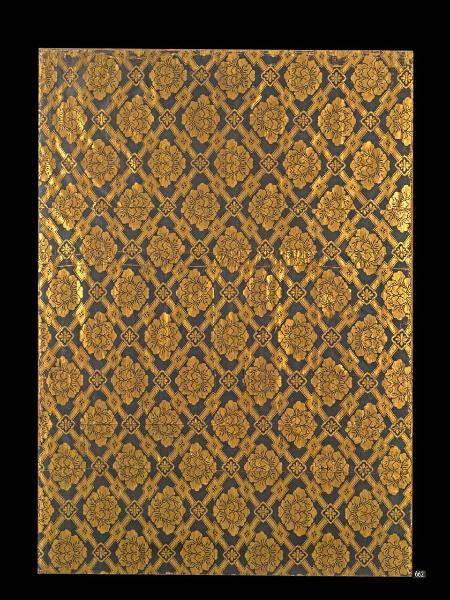 Tessuto operato con trame supplementari in oro cartaceo. (probabilmente kiran). Serie di quattro fasce verticali di diverse dimensioni cucite assieme e montate su pannello di legno. Fondo verde scuro con disegno in oro lucido cartaceo di diagonali incrociate a losanga congiunte da piccole losanghe con al centro variante "fiore cinese" (karahana) e intramezzate da altre piccole losanghe con all'interno croce svastica (manji). All'interno delle losanghe principali si alternano una volta rivolte in alto, una volta in basso peonie di grandi dimensioni (o botan) disposte su file orizzontali, parallele e sfalsate diagonalmente. Montato su pannello in legno.