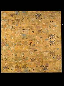 Tessuto operato con ordito in seta e trame di fondo in seta e oro cartolino (12 trame al cm). Trame supplementari in seta a fascio policroma costituiscono il soggetto vegetale e gli oggetti del disegno. Pannello composito costituito da 4/5 altezze di tessuto, composte da più pezzi, cuciti tra loro (intervento realizzato in Giappone). Tessuto operato con trame supplementari in seta e in oro cartaceo. Serie di cinque fasce orizzontali (quattro regolari e una irregolare) cucite assieme e montate su pannello di legno. Fondo giallo, disegno policromo (marrone, azzurro, rosa, bianco) con coppie di cesti fioriti alternativamente rivolti verso l'alto e verso il basso, disposti su linee orizzontali, parallele e sfalsate diagonalmente. Il fondo è spartito da motivo in oro lucido cartaceo di un graticcio di linee diagonali incrociate (tasuki). Montato su pannello in legno.