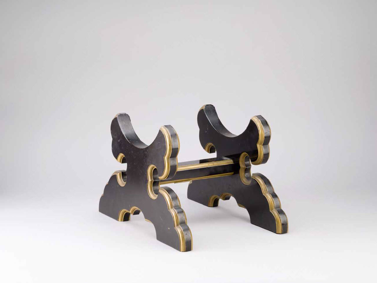 Sostegno per tamburo in legno laccato nero e profilato in oro, con piano concavo.