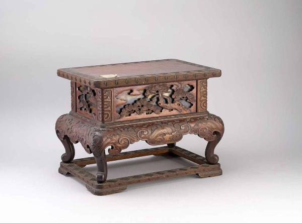 Tavolino in legno rosso, con cartelle traforate, che lasciano vedere attraverso un vetro una decorazione di pini e onde su della tartaruga.