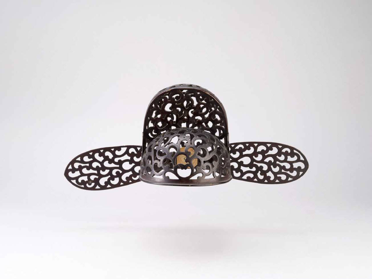 Copricapo traforato in lacca marrone con due alette laterali (tatemono) di forma lobata annesse posteriormente.