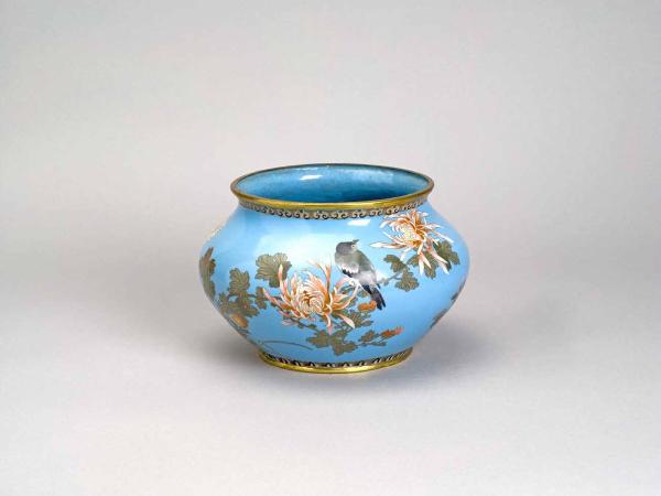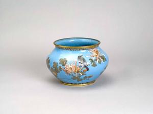Vaso a sezione circolare in bronzo decorato sull'esterno a smalti policromi con la tecnica del cloisonnée. La decorazione mostra, su fondo turchese, scene con fiori e uccelli.