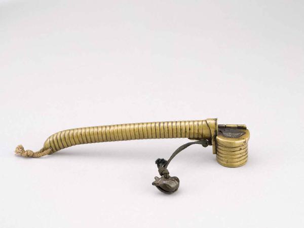 Calamaio (yatate) in ottone costituito da recipiente e portapennello; ad un anello di quest'ultimo si lega un cordoncino in tessuto con campanellino.