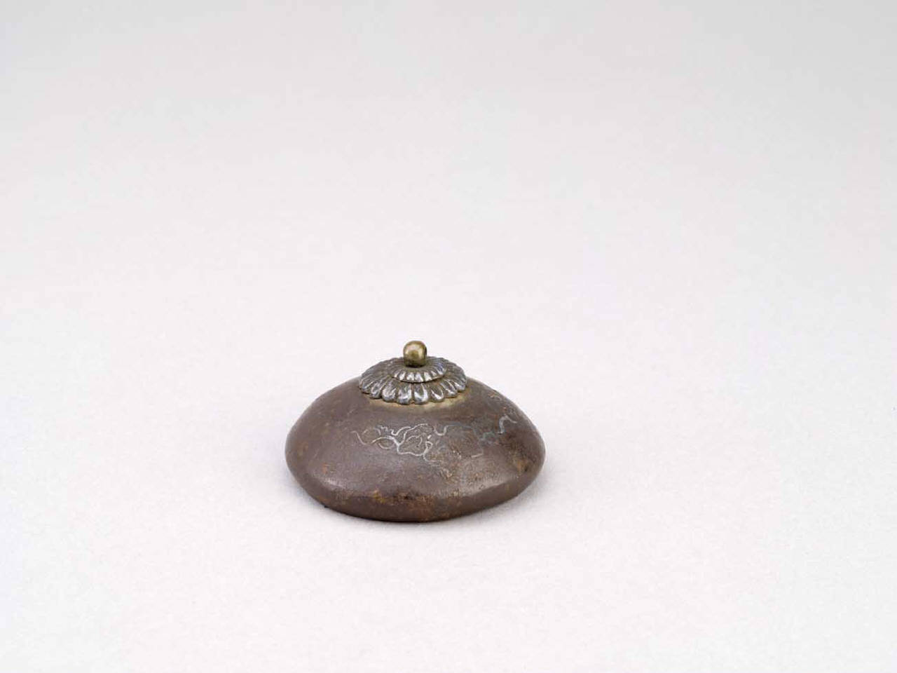 Netsuke in metallo di forma emisferica ornato ad agemina d'oro e di argento con motivi fitomorfi.