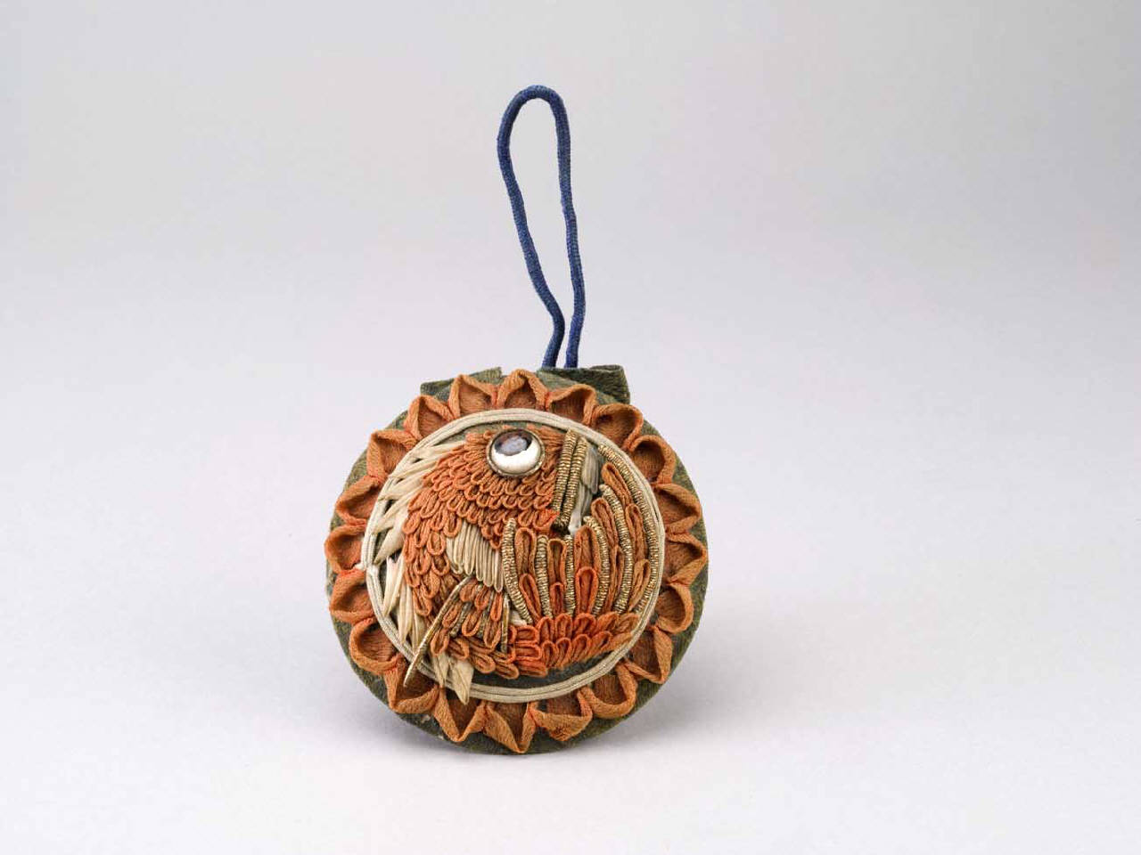 Portaspilli in stoffa. Retro verde; avanti con un applique di carpa rossa con occhio in vetro contro il malocchio. Il retro è in tessuto operato con lavorazione in diagonale.