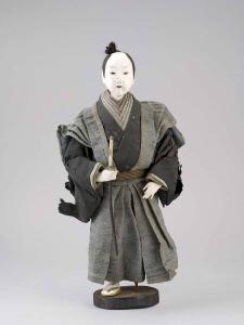 Bambola con testa e mani in legno, occhi e bocca dipinti, abito in seta è posta su un piedistallo ovale. Raffigura un samurai con katana impugnata con la mano destra; l'abito esterno (kamishimo) è decorato con motivo tipo komon (ripetizione di piccoli motivi) in diverse tonalità di grigio; s'intravedono anche lembi dell'abito interno.