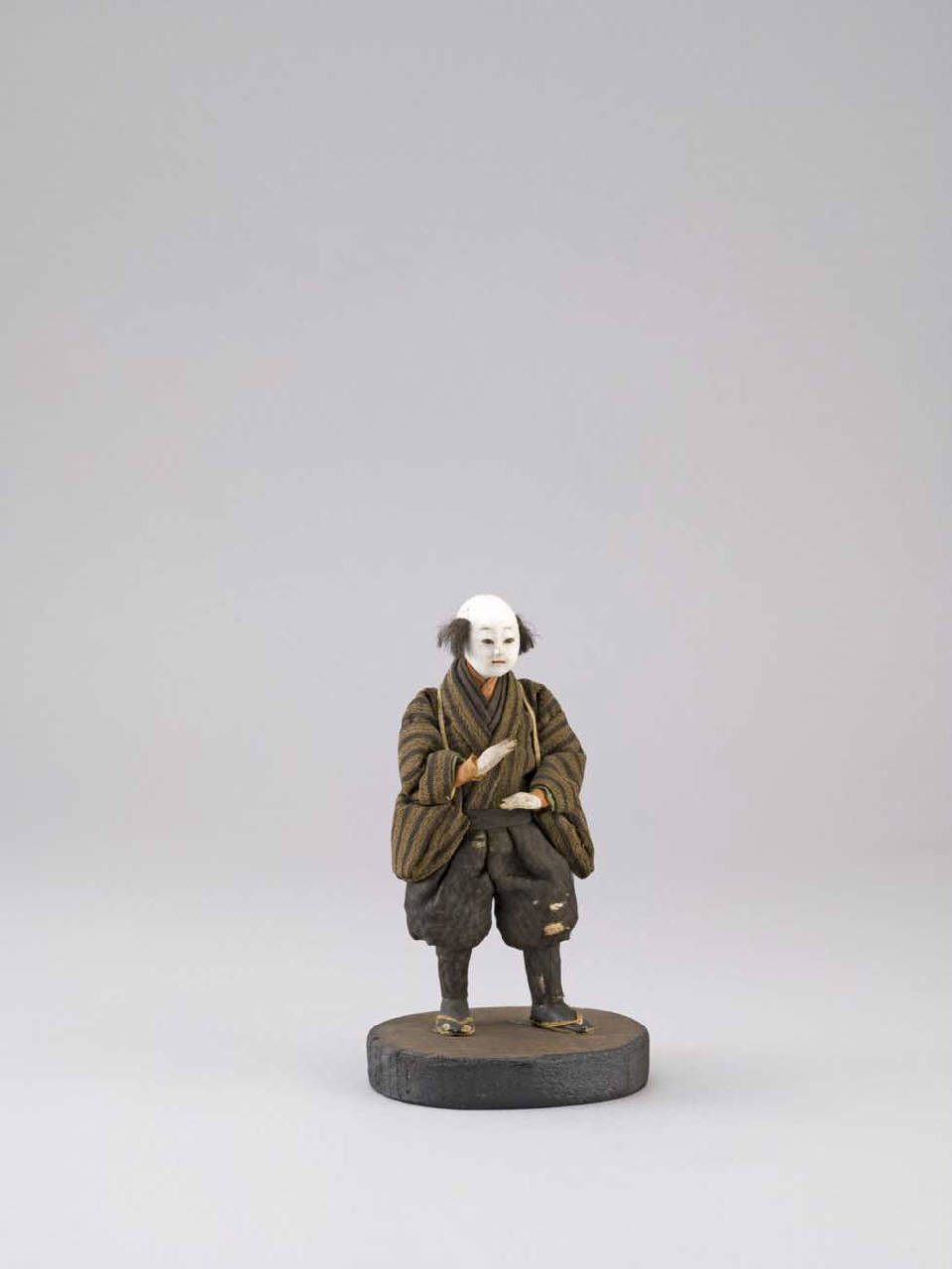 Bambola con testa e mani in legno, occhi e bocca dipinti, abito in seta è posta su un piedistallo ovale. Raffigura un uomo con giacca grigia e oro a strisce (motivo komochi) e hakama grigi a scacchi (motivo koshi).