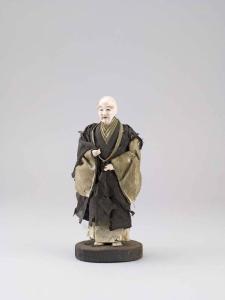 Bambola con testa e mani di legno, occhi e bocca dipinti, abito in seta e posto su un piedistallo ovale. Raffigura un uomo con abiti scuri.