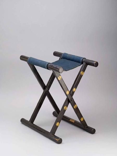 Sgabello pieghevole a gambe incrociate (shogi) in legno laccato. Ornato con minuto mon, foglie e fiori in oro. Sedile in feltro, seta e cartone.