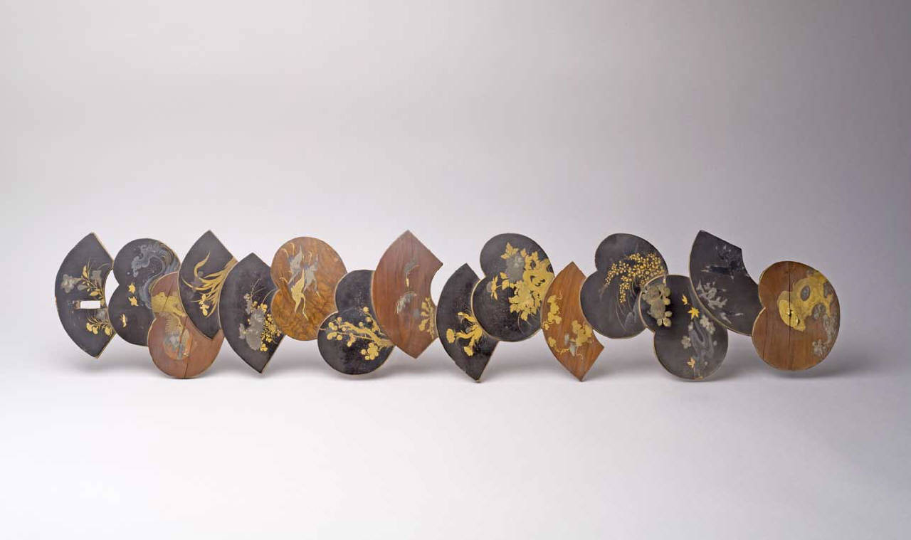Pannello in legno laccato nero ornato con elementi a ventaglio e a cuore decorati internamente con fiori, volatili e alberi di ciliegio, con foglie in oro e argento.