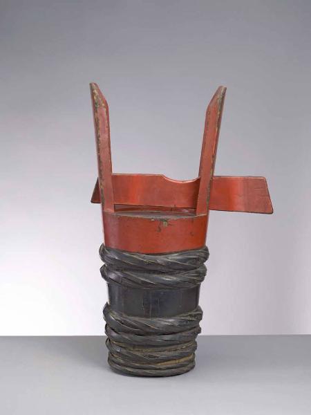 Contenitore per sake a corna (tsunodaru) in legno laccato rosso e nero avvolto da fasce di bambù laccate. Iscrizioni in nero.