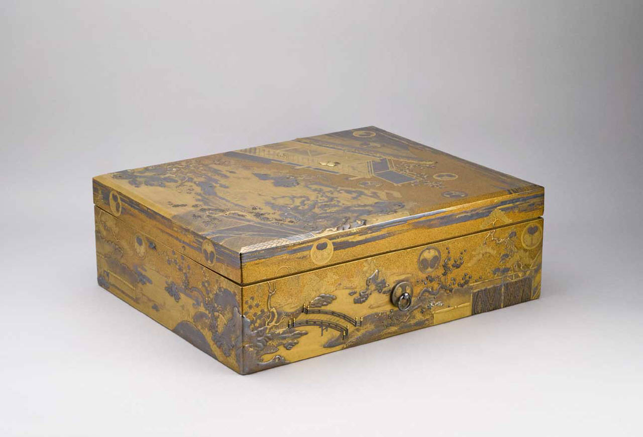- NOTIZIE STORICO CRITICHE In base a quanto arguito da Mayumi Koyama (1996: v. BIB), questa splendida scatola da cancelleria (bunko) fu realizzata in occasione del matrimonio tra Chiyohime (1633-1698), primogenita dello shogun Tokugawa Iemitsu (nipote di Ieyasu, fondatore dello shogunato Tokugawa), con Tokugawa Mitsutomo (1625-1700), capo del ramo della famiglia a Owari (attuale prefettura di Aichi): i due si sposarono nel 1639 quando la principessa aveva solo tre anni. Intorno a quella data, quindi, si può datare la realizzazione del grande servizio di oggetti laccati - noto con l'appellativo di "Hatsune no chodo" - al quale appartiene anche questa scatola del Castello Sforzesco; il servizio fu poi registrata nel "Catalogo degli oggetti del Ryosen-in" (Ryosen-in sama odogu mokuroku) compilato nel 1701: Ryosen-in è il nome che Chiyohime prese in seguito al suo ingresso in convento. L'intera opera fu realizzata in circa tre anni da Koami Choju [Nagashige] (1599-1651), uno tra i più valenti laccatori del suo tempo, sotto la supervisione di Iwasa Matabei (1578-1650), notissimo pittore dell'epoca. L'intero servizio, formato di un numero imprecisato di pezzi, fu smembrato nel XIX secolo: il nucleo principale è attualmente conservato presso il Tokugawa Art Museum di Nagoya, altri esemplari sono sparsi in giro per il mondo. Oltre ad un qualità della laccatura straordinaria, resa con l'ausilio di varie tecniche varianti del maki-e ("pittura a oro spruzzata"), tra cui hiramaki-e, togidashi, takamaki-e, tsukegaki, kirikane, nashiji, stesura metalliche di vario tipo, forse applicate dall'artigiano Goto Kenjo, tutti i pezzi di questo famoso servizio sono accomunati da un medesimo soggetto, ovvero immagini ispirate al capitolo Hatsune del "Romanzo del Principe Splendente" (Genji monogatari), opera di Murasaki Shikibu risalente all'inizio dell'XI secolo: in questo capitolo si narra di uno scambio di doni per l'Anno Nuovo, tema che si ritenne potesse essere di buon auspicio per l'inizio della vita coniugale della principessa. Sulla superficie esterna della scatola si vedono quindi un padiglione, un corso d'acqua e una serie di alberi di pino (matsu) portafortuna; è inoltre presente, ripetuto per più volte, il mon (simbolo araldico) dei Tokugawa, ovvero le tre foglie di malva (aoi), e l'iscrizione di una poesia waka (trentuno sillabe), tratta anch'essa dal capitolo Hatsune del Genjii monogatari, resa sia con la tecnica detta ashide-e, ovvero con le linee degli ideogrammi che si mimetizzano tra gli altri decori naturalistici presenti sulla scatola, sia con la tecnica uta-e, ovvero interponendo tra gli ideogrammi disegni che sostituiscano il suono degli stessi.\n\nIn mostra all'Esposizione Storica d'Arte Industriale. Milano, 1874.\nPezzi dello stesso corredo presso vari istituti nel mondo:\nhttps://www.metmuseum.org/art/collection/search/40472?who=K%c5%8dami+Ch%c5%8dj%c5%ab+(Nagashige)%24K%c5%8dami+Ch%c5%8dj%c5%ab+(Nagashige)&ao=on&ft=*&offset=0&rpp=20&pos=1\nhttps://www.clevelandart.org/art/1970.28.a 1970.28.b\nhttps://www.kyuhaku.jp/en/exhibition/exhibition_pre162.html\nhttps://www.tokugawa-art-museum.jp/en/about/treasures/lacquerware/post-01/