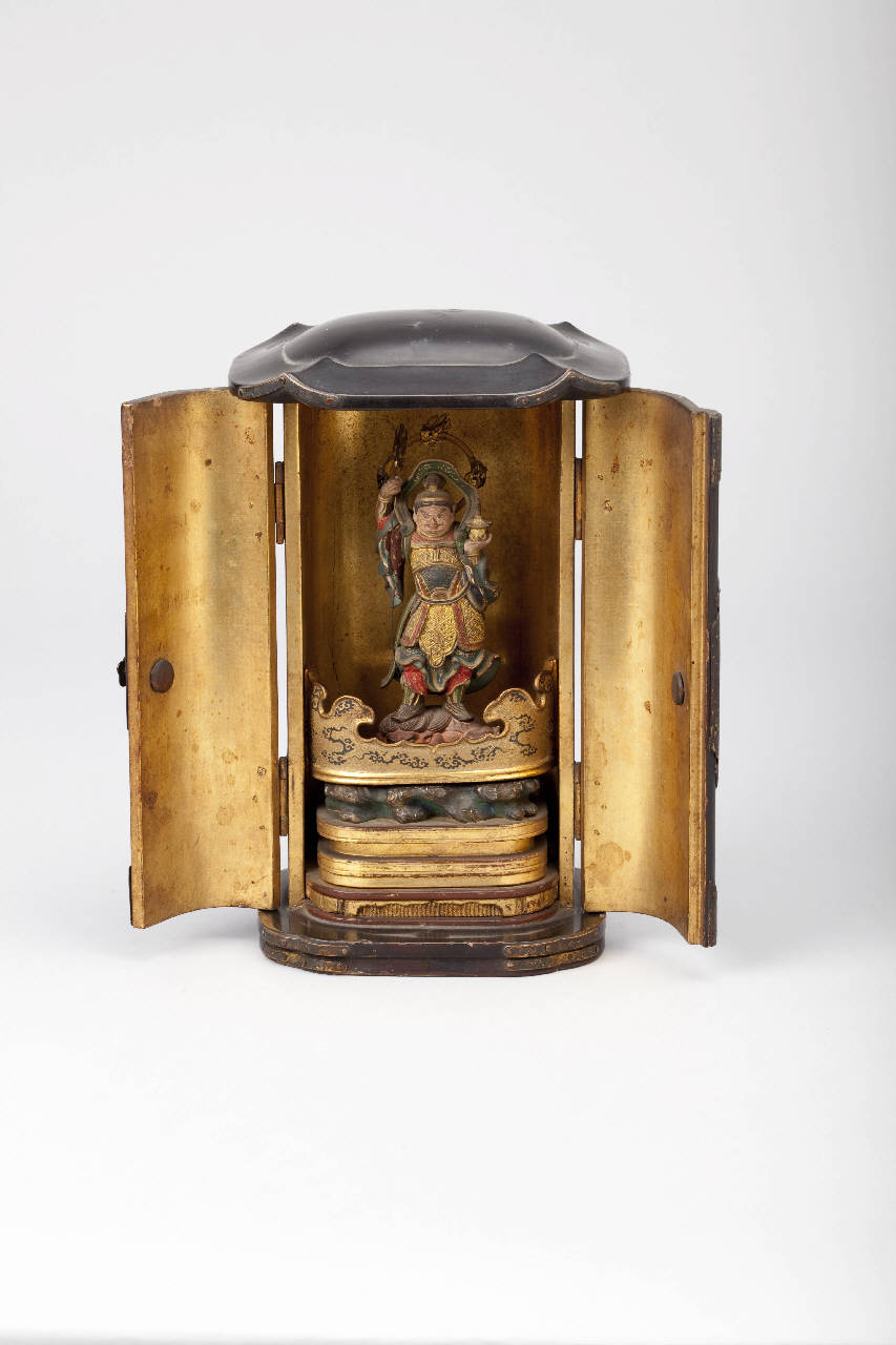 Tempietto portatile (zushi) a forma di parallelepipedo con angoli arrotondati, sormontato da tetto a cupola ribassata con i lati sporgenti. In legno laccato, di nero omogeneo sull'esterno e di oro all'interno, è dotato di serrature e finimenti in rame dorato ornato con motivi floreali a incisione. All'interno è sistemata una piccola scultura raffigurante Bishamonten che calpesta un demone, posata su un'alta base a più livelli sovrapposti. Il piano più in alto, ove posa la scultura, è arricchito da una balaustra con il bordo superiore intagliato a ogive che ricordano nuvole, dipinto sull'esterno a inchiostro nero con arabeschi che ricordano anch'essi nuvole.