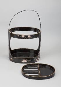 Contenitore per cibi in legno laccato di nero omogeneo sul quale si dispongono mazzetti di fiori dipinti in vari colori; filettature in oro. Contenitore in bronzo.