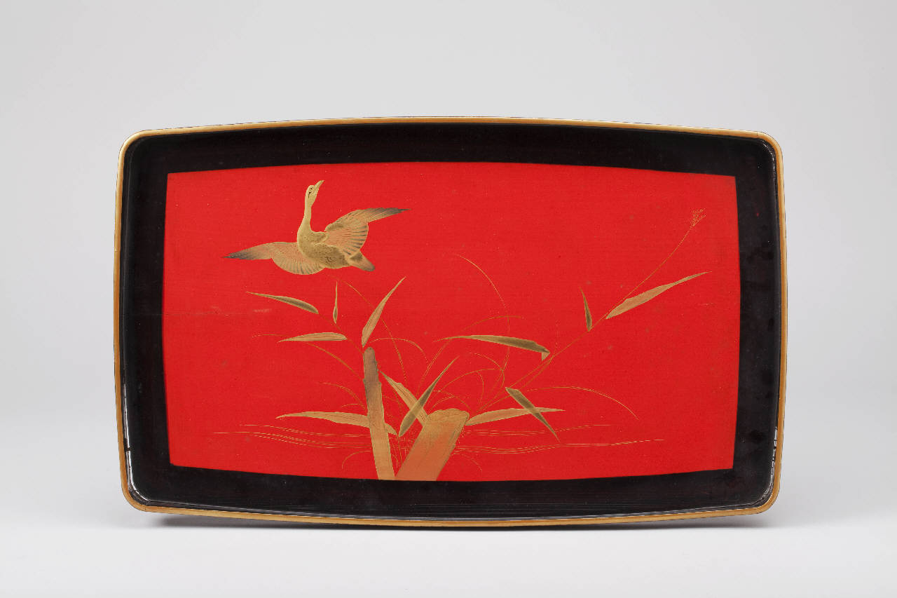 Vassoio di forma all'incirca rettangolare laccato di rosso e di nero con decorazione di oca in volo e fusti di bambù in hiramaki-e ("pittura cosparsa piatta").