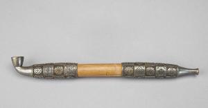 Pipa (enkan o kiseru) in bambù laccato e bronzo argentato. Le parti argentate sono decorate a sbalzo e incisione con motivi stilizzati di vario genere sistemati entro quadrati appaiati.