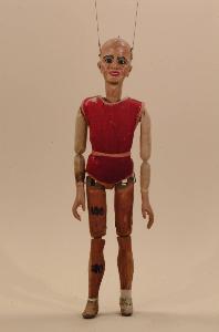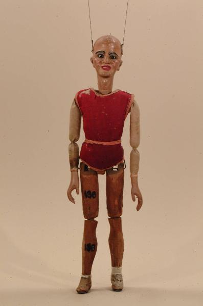 Corpo con busto rigido e tozzo con spalle applicate con colla e chiodi; gambe sproporzionate; femori corti e polpacci lunghi; le gambe presentano strani incastri nella parte superiore la cui funzione non è chiara; testa con bocca e occhi fissi; mani arcuate rigide con dita unite; piedi fissi con suoletta in piombo; bilancino originale a croce metodo Holden