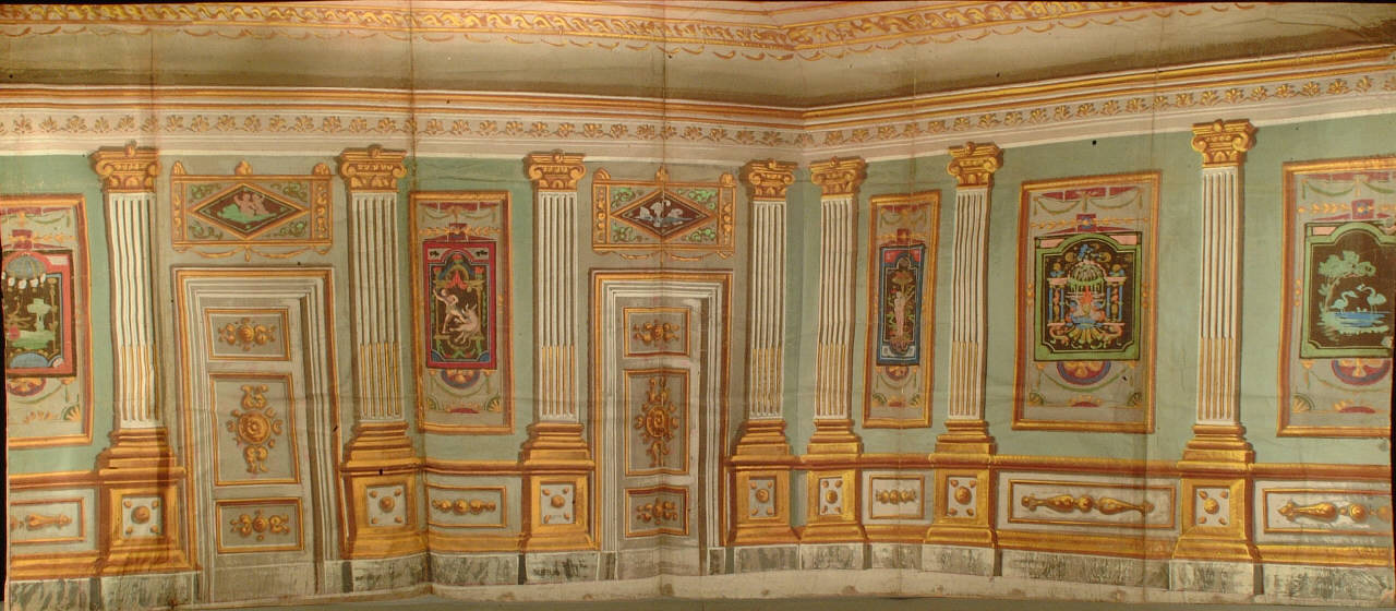 Scenografia in carta, fortezzata con strisce di tessuto di cotone, dipinta ad acqua e composta da un solo fondale.