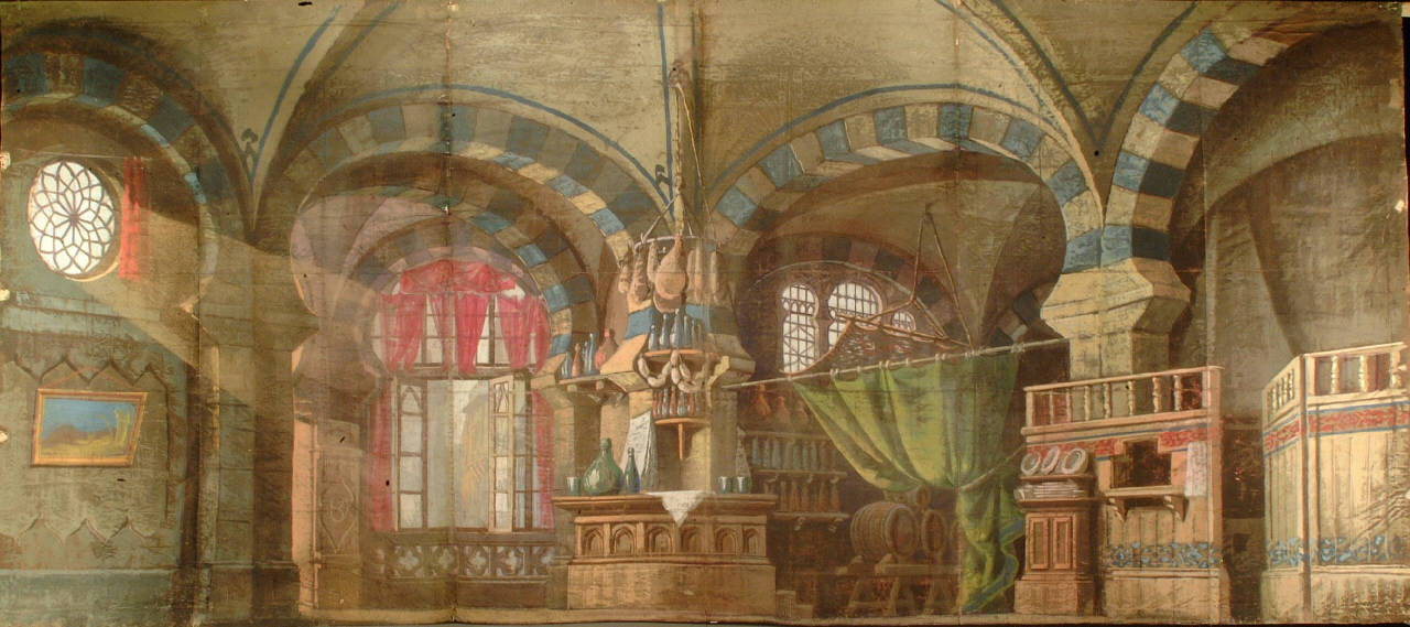 Scenografia in carta, fortezzata col strisce di tessuto di cotone, dipinta ad acqua e composta da un solo fondale.