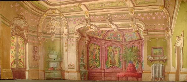 Scenografia in carta, fortezzata con strisce di tessuto di cotone, dipinta ad acqua e composta da un solo fondale che prevede una trasparenza dipinta per rendere fluorescente la vetrata raffigurata.