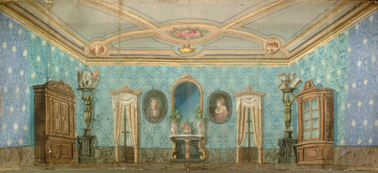 Scenografia in carta, fortezzata con strisce di tessuto di cotone, dipinta ad acqua e composta da un solo fondale.