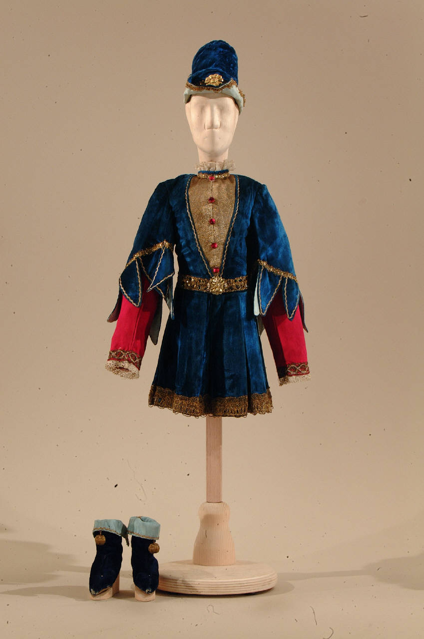 Costume per paggio di foggia rinascimentale composto da veste, scarpe e cappello