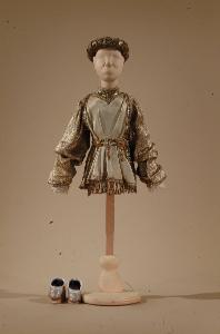 Costume per paggetto di foggia rinascimentale composto da veste, pazienza, sopravveste per il trucco, turbantino e scarpe