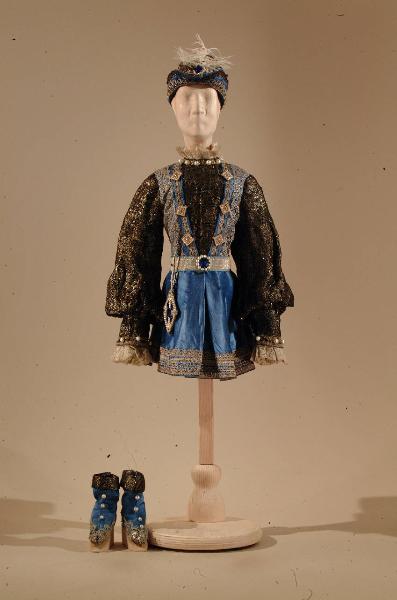Costume per nobile di foggia rinascimentale composto da veste, cintura con borsetta, cappello e scarpe