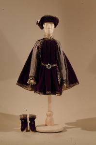 Costume per nobile di foggia rinascimentale composto da veste, mantellina, cappello, scarpe