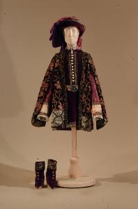 Costume per nobile di foggia rinascimentale composto da veste, sopravveste, scarpe, cintura e cappello