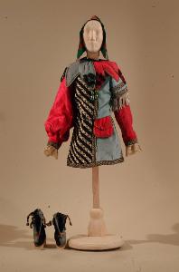 Costume per buffone di foggia rinascimentale composto da veste, collettone, scarpe e cappello