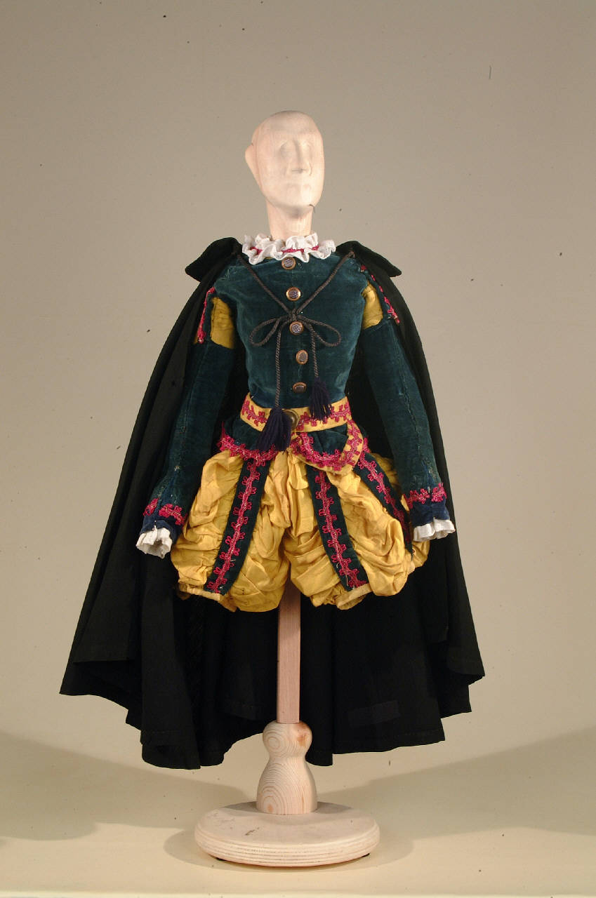 Costume borghese del '500 costituito da pantaloni, corpino, cintura, mantellina, mantello, cappello, scarpe